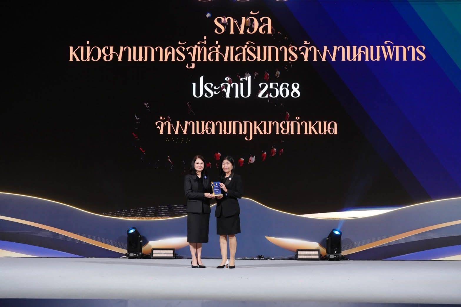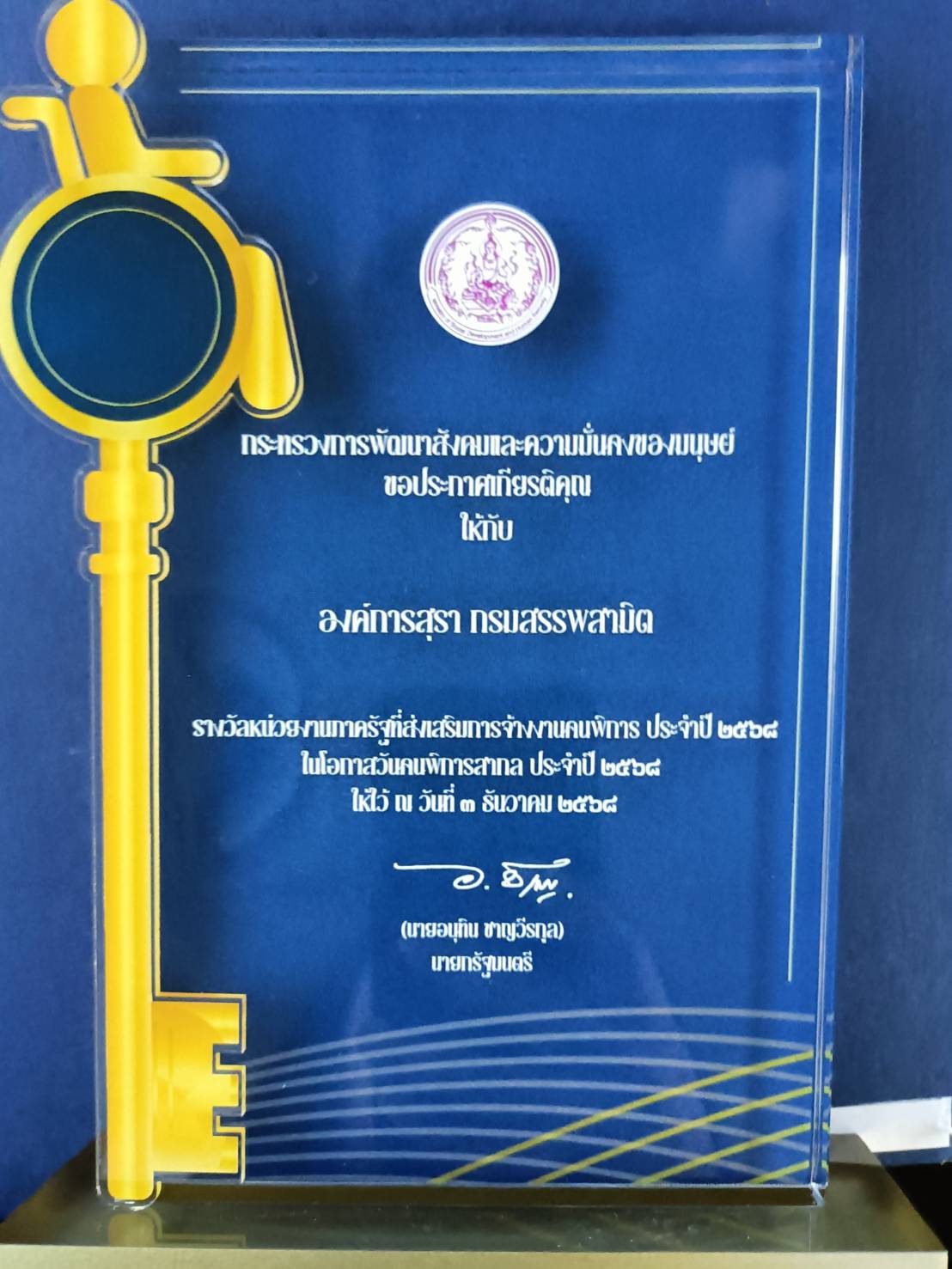 นางสาวจุไรรัตน์ สิริพัฒนธาดา หัวหน้ากองกลาง ผู้แทนผู้อำนวยการองค์การสุรา เข้ารับโล่ประกาศเกียรติคุณรางวัลหน่วยงานภาครัฐที่ส่งเสริมการจ้างงานคนพิการ ประจำปี 2568 ซึ่งรางวัลดังกล่าวมีวัตถุประสงค์เพื่อสร้างความตระหนักและส่งเสริมให้ทุกภาคส่วนในสังคมได้ร่วมกันสร้างสังคมที่เป็นธรรม เสมอภาค เท่าเทียม เป็นสังคมที่ทุกคนอยู่ร่วมกันอย่างมีความสุข โดยมี นางสาวสนธยา บุณยภูษิต อธิบดีกรมส่งเสริมและพัฒนาคุณภาพชีวิตคนพิการ ให้เกียรติมอบโล่ประกาศเกียรติคุณดังกล่าว ณ ห้องรอยัล จูบิลี่ บอลรูม อาคารชาเลนเจอร์ อิมแพ็ค เมืองทองธานี จังหวัดนนทบุรี เมื่อวันที่ 3 ธันวาคม 2568
