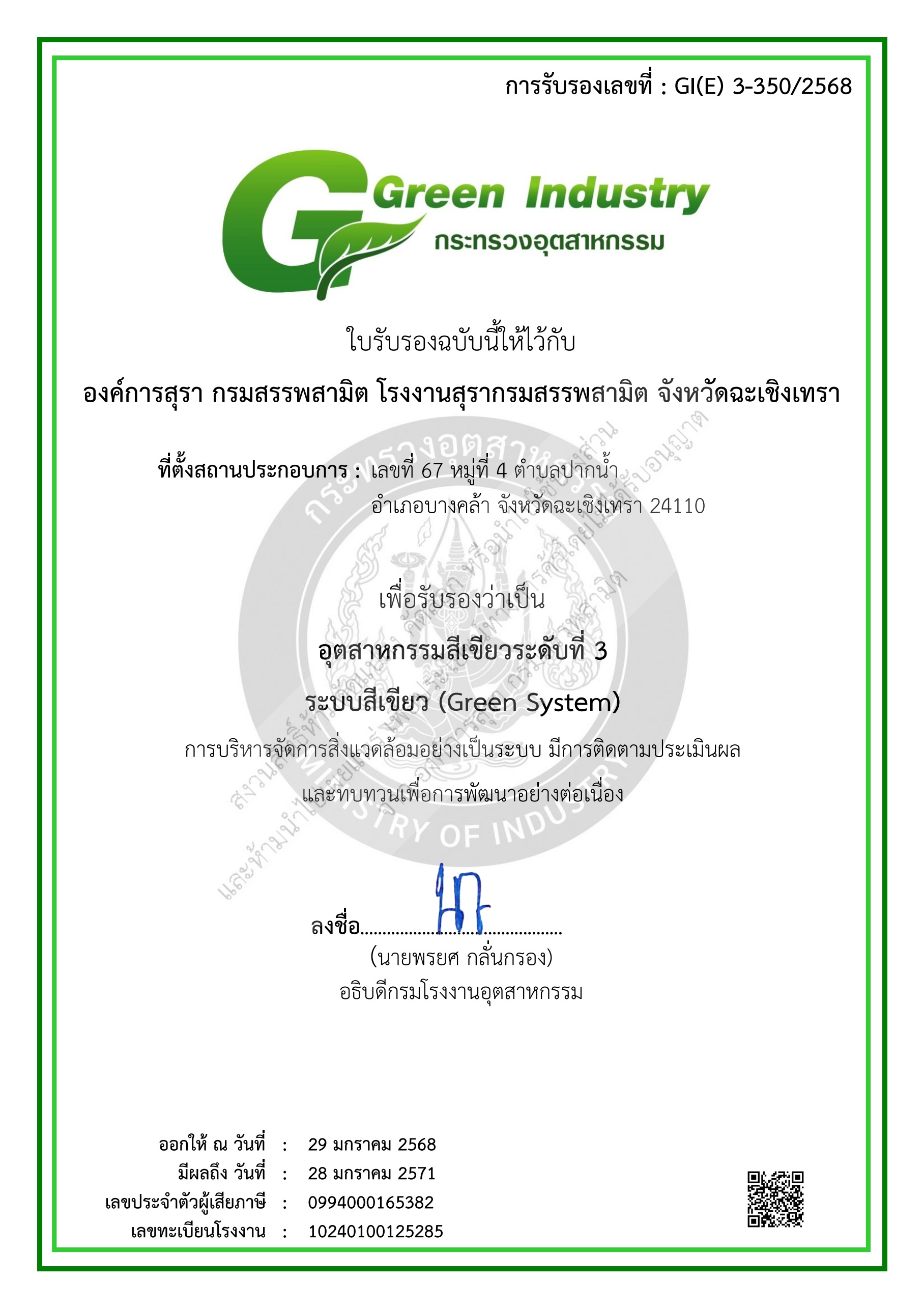 ใบรับรองอุตสาหกรรมสีเขียวระดับที่ 3 ระบบสีเขียว (Green System)