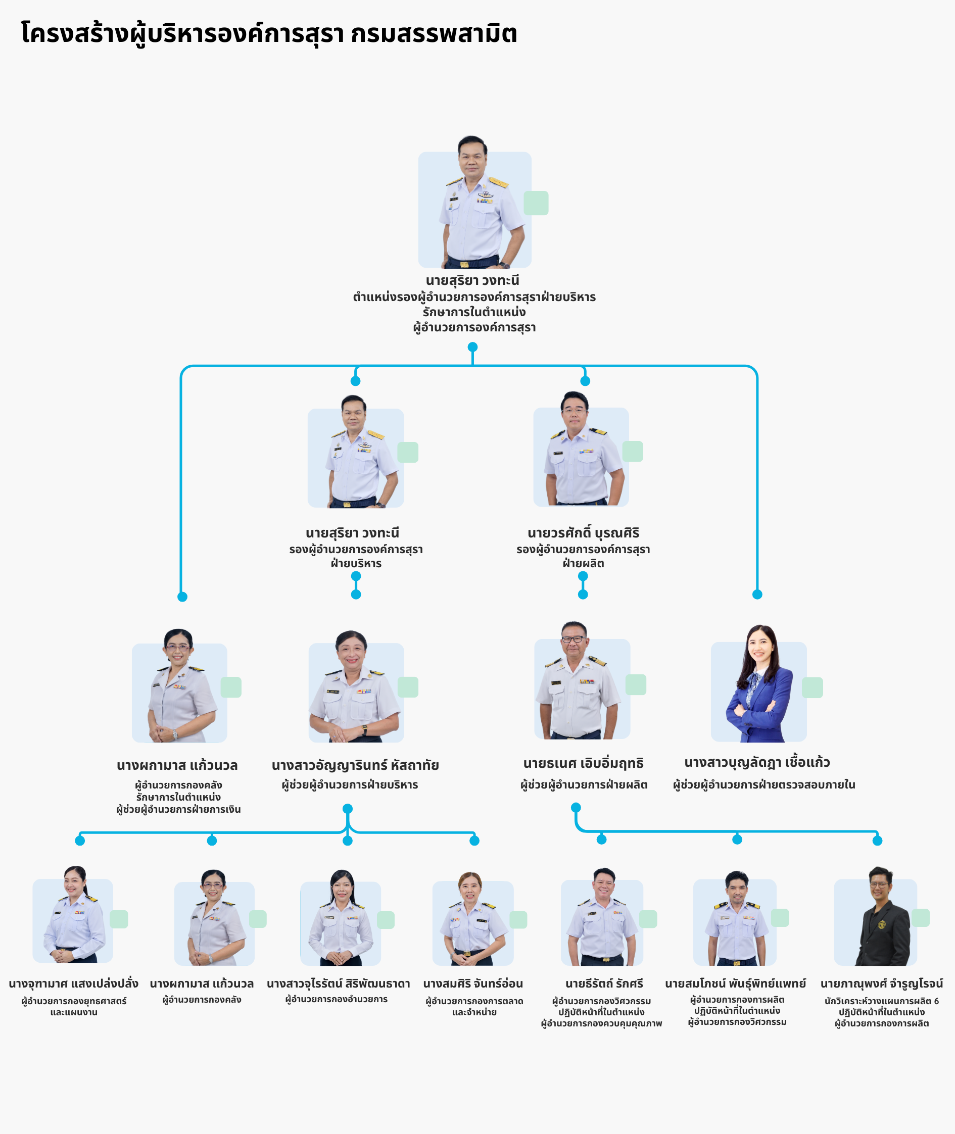 ตามระเบียบกระทรวงการคลังว่าด้วยการจัดตั้งองค์การสุรา กรมสรรพสามิต (ฉบับที่ 3) พ.ศ. 2556 ข้อ 12 กำหนดให้มีคณะกรรมการบริหารกิจการขององค์การสุราคณะหนึ่ง ประกอบด้วย อธิบดีกรมสรรพสามิตหรือที่ปรึกษา หรือรองอธิบดีที่ได้รับมอบหมายจากอธิบดีกรมสรรพสามิต เป็นประธานกรรมการ ที่ปรึกษาหรือรองอธิบดีที่ได้รับมอบหมายจากอธิบดีกรมสรรพสามิต จำนวน 2 คน เป็นรองประธานกรรมการ ผู้อำนวยการ เป็นกรรมการและเลขานุการโดยตำแหน่ง และกรรมการอื่นอีกมีจำนวนไม่น้อยกว่าสามคน แต่เมื่อรวมกรรมการ ทั้งคณะหมดแล้ว ต้องมีจำนวนไม่เกินสิบเอ็ดคน ซึ่งในกรรมการอื่นนี้ ให้มีผู้แทนกระทรวงการคลังเป็นกรรมการร่วมด้วยหนึ่งคน กรรมการอื่น รวมทั้งผู้แทนกระทรวงการคลังและที่ปรึกษาคณะกรรมการรัฐมนตรีเป็นผู้แต่งตั้งและถอดถอน