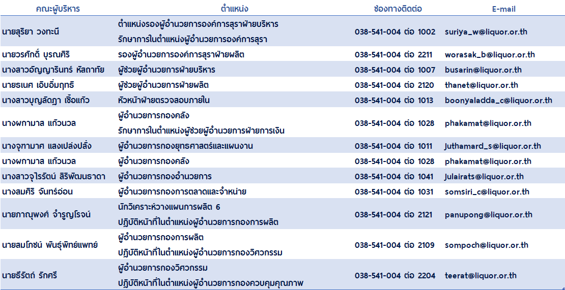 ปัจจุบันคณะกรรมการบริหารกิจการองค์การสุราฯ มีจำนวน 11 คน ประกอบด้วยผู้ที่มีความรู้ ความสามารถ ทักษะและประสบการณ์การทำงานจากหลากหลายสาขาวิชาชีพ ซึ่งเป็นประโยชน์ต่อการดำเนินกิจการขององค์การสุราฯ