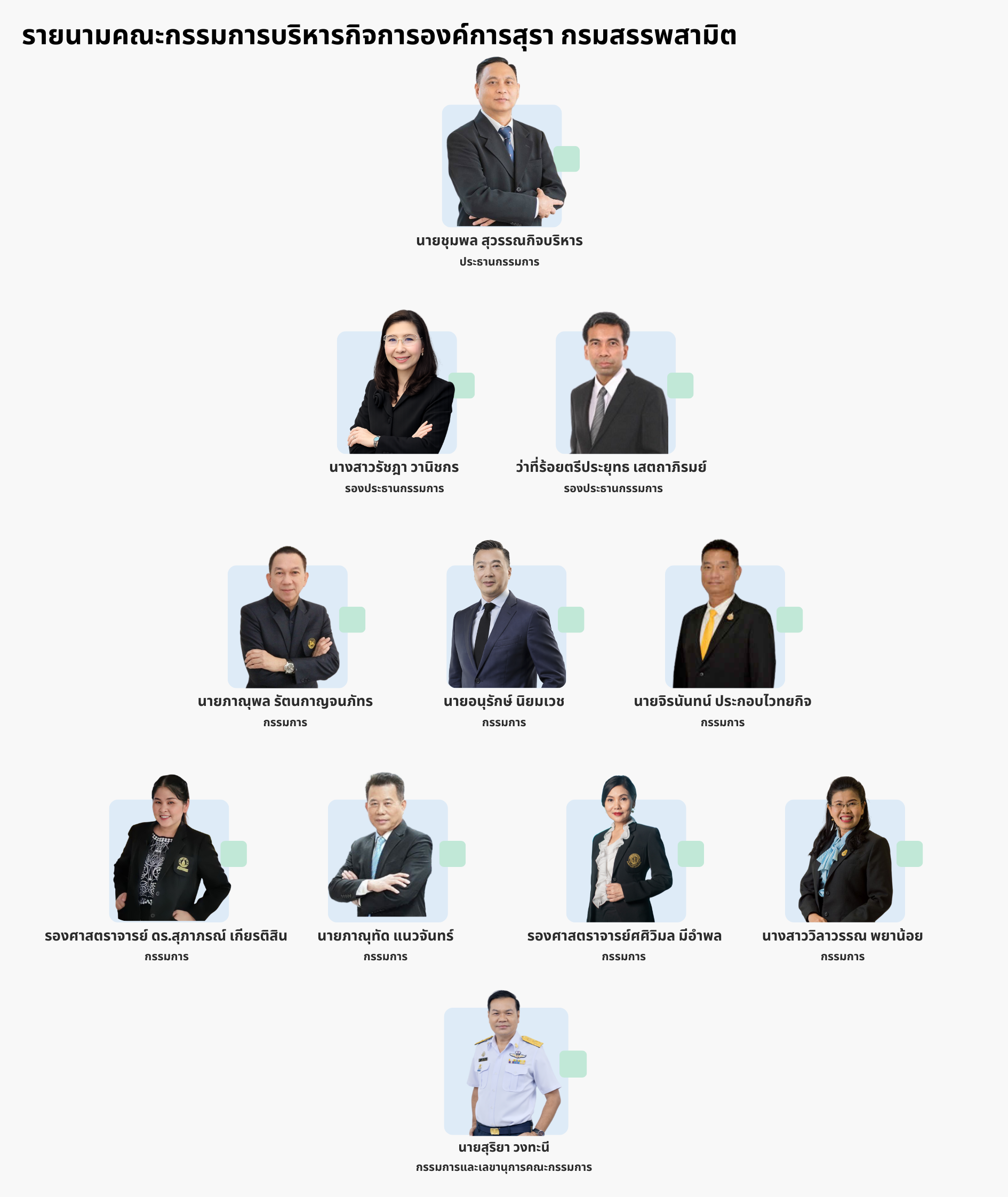 ปัจจุบันคณะกรรมการบริหารกิจการองค์การสุราฯ มีจำนวน 11 คน ประกอบด้วยผู้ที่มีความรู้ ความสามารถ ทักษะและประสบการณ์การทำงานจากหลากหลายสาขาวิชาชีพ ซึ่งเป็นประโยชน์ต่อการดำเนินกิจการขององค์การสุราฯ